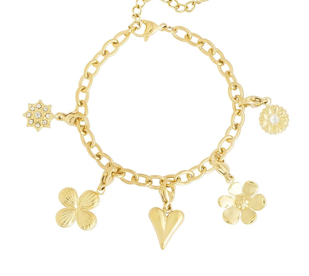 Wunderschönes Armband mit fünf verschieden Charms, darunter Blumen und ein glänzendes Herz.