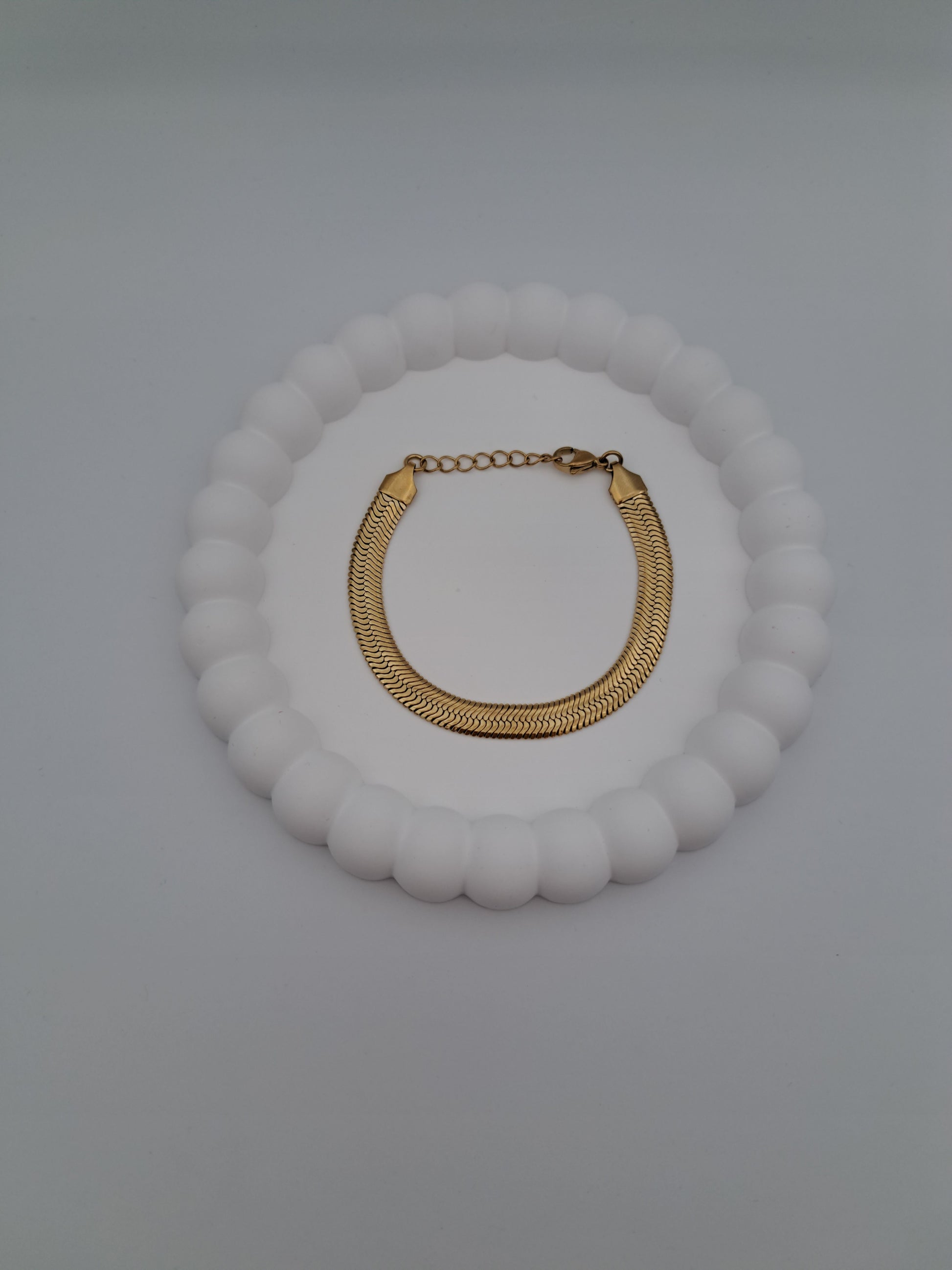 Wunderschönes Schlangenarmband Nyra, mit flacher Gretenstruktur und seidigem Goldglanz.